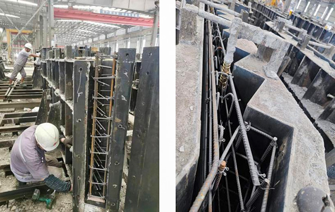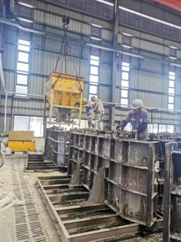 混凝土經攪拌罐生產完畢后,經由吊斗運輸到澆筑區澆筑。將混凝土澆筑到模具后,進行振搗。